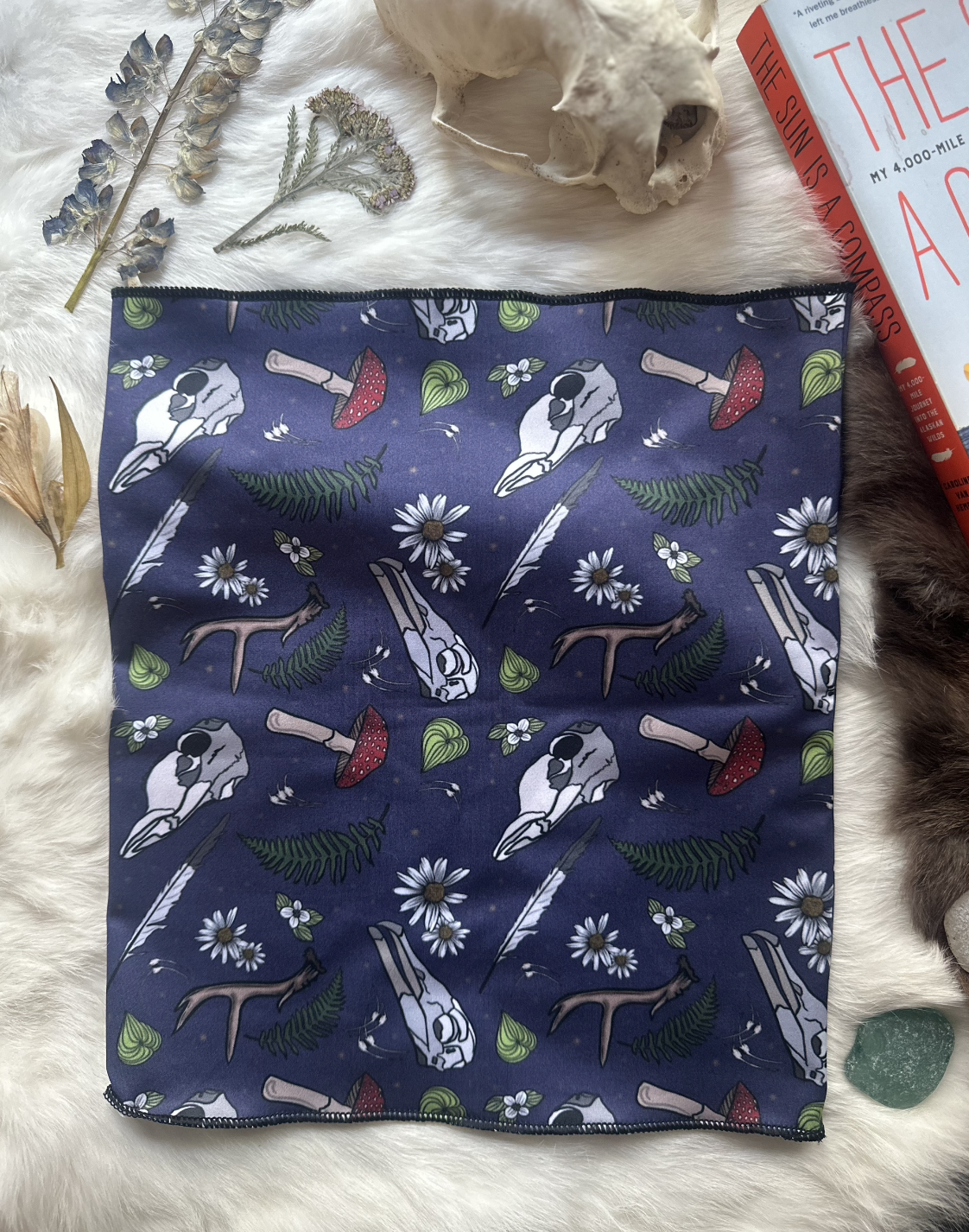 This zipper pouch features an original pattern with skulls, antlers, mushrooms, and other forest floor things. These bags have a zipper enclosure and a cloth divider that doubles as a couple of pockets on the inside. They are 10” wide and made with a denim canvas that feels really nice and sturdy. Use as a toiletry bag, to carry art supplies, or however you see fit :)